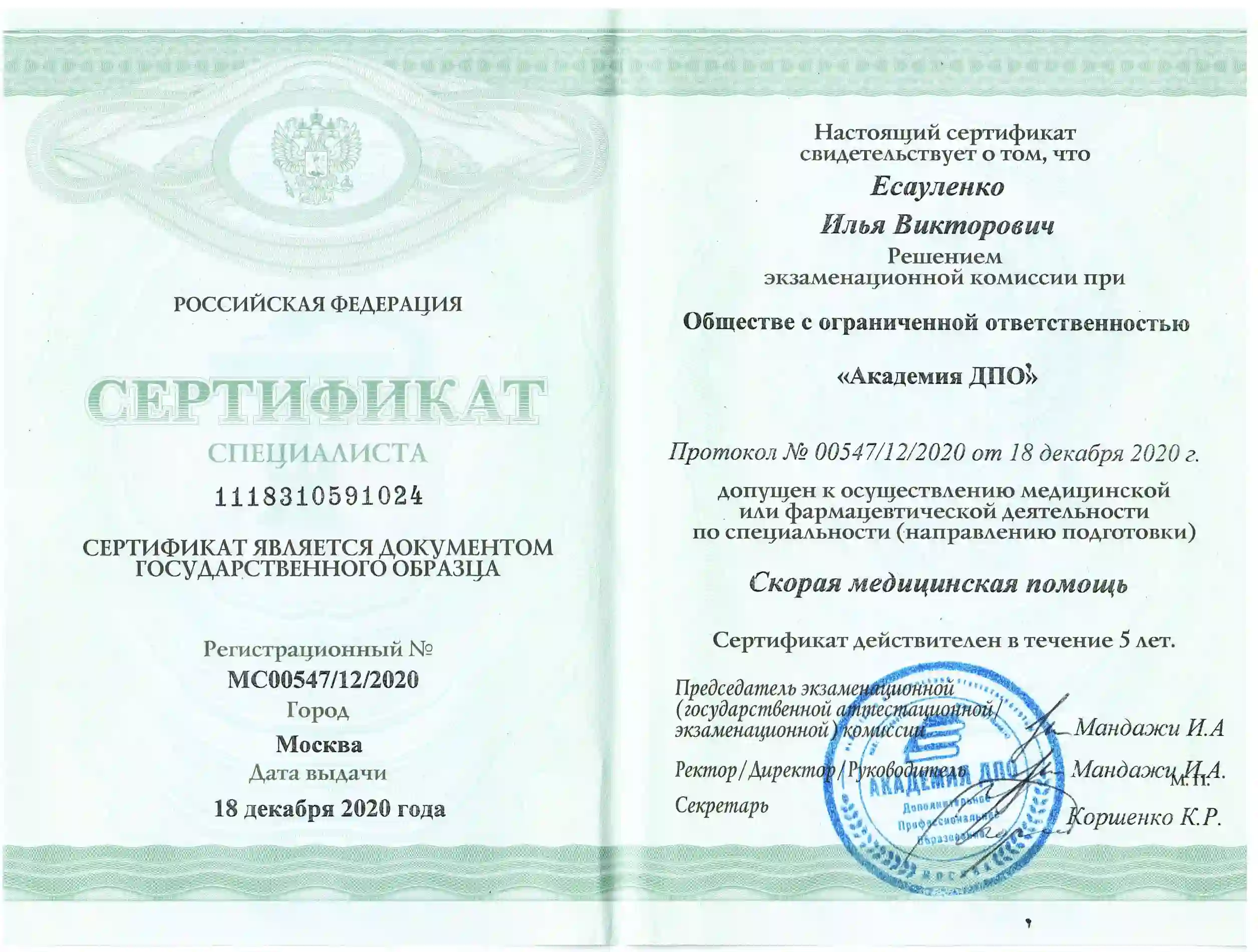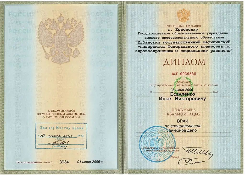2014 г.  Военно-медицинская академия им. Кирова в г. Санкт-Петербурге по специальности «терапия».
