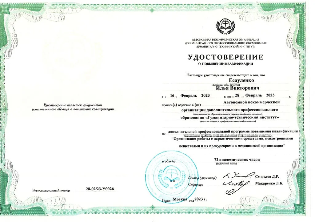 2020 г.  ЧУДПО «Региональный центр дополнительного образования» в г. Бакале по дополнительной профессиональной программе «Организация деятельности, связанной с оборотом наркотических средств, психотропных веществ и их прекурсоров».